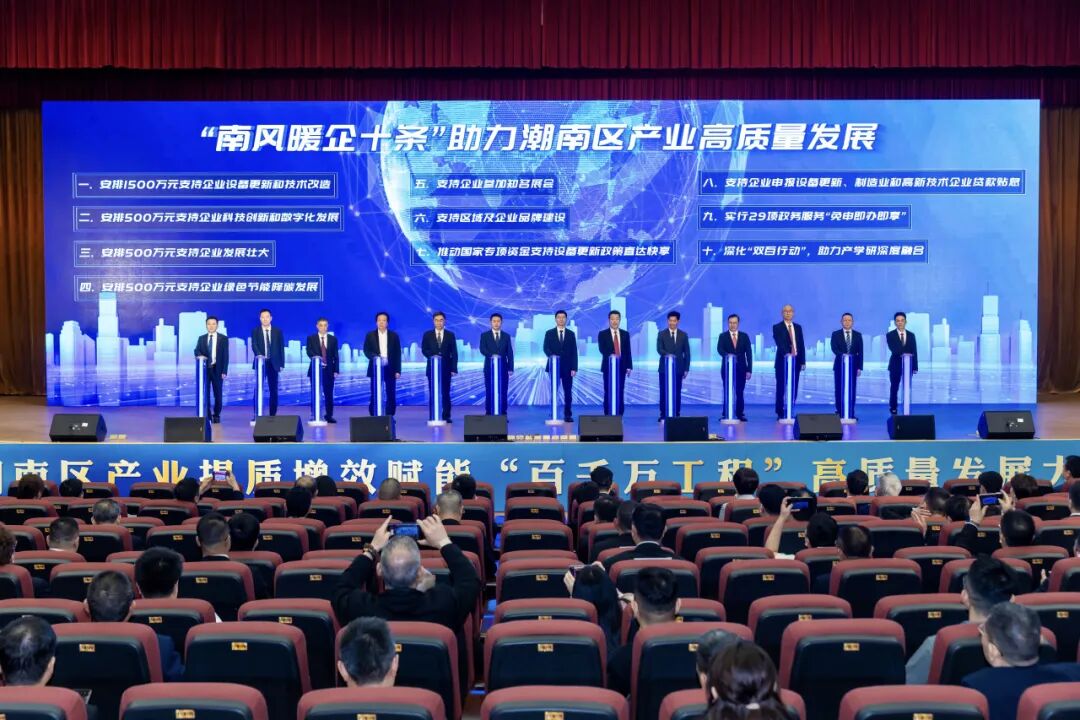 会上播放了《潮起南山向“新”而行》宣传片;通报了2025年度全区纳税大户、新增上规上限企业名单;区发改局、区工信局、峡山街道、陈店镇及企业家代表作发言;举行了“南风暖企十条”助力潮南区产业高质量发展见证仪式。